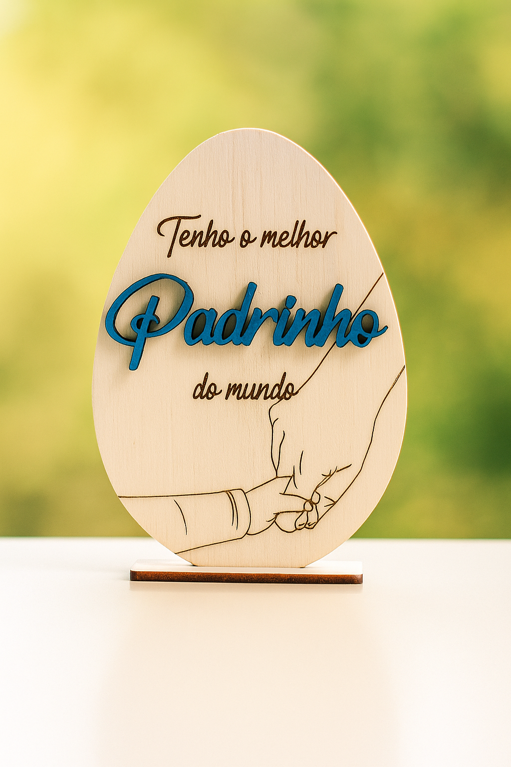 Surpreende o padrinho com uma lembrança única e cheia de significado! Esta placa em formato oval é fabricada em madeira natural e apresenta uma elegante gravação a laser com a frase: "Tenho o melhor Padrinho do mundo", em combinação com uma ilustração delicada de mãos entrelaçadas símbolo de ligação e carinho eterno.